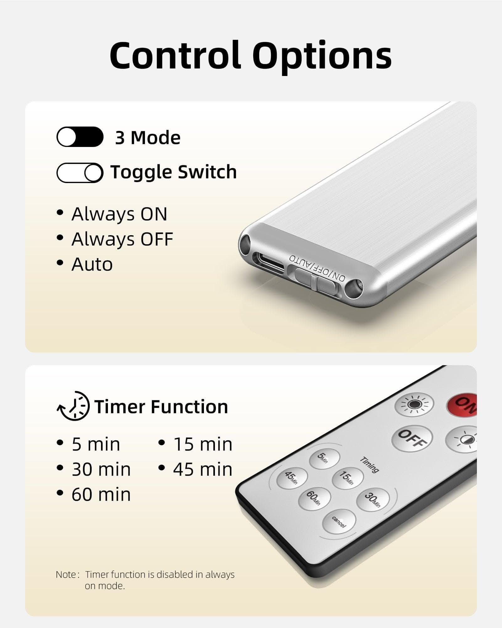 Customize brightness from 0–100% and set timers for enhanced energy efficiency (great for placing in high or hard-to-reach areas).