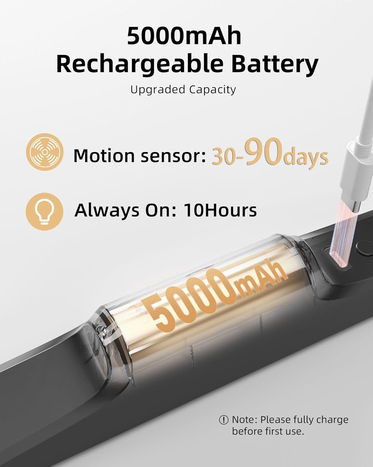 Stay powered longer with a built-in 5000mAh battery. In AUTO mode, the light lasts 30–90 days with 10–20 daily activations (20 seconds each). In Always-On mode, enjoy up to 10 hours at max brightness or 20 hours on the lowest setting. (Note: Charge fully before first use.)🌀 60° Adjustable Angle & Strong Magnetic Mounting